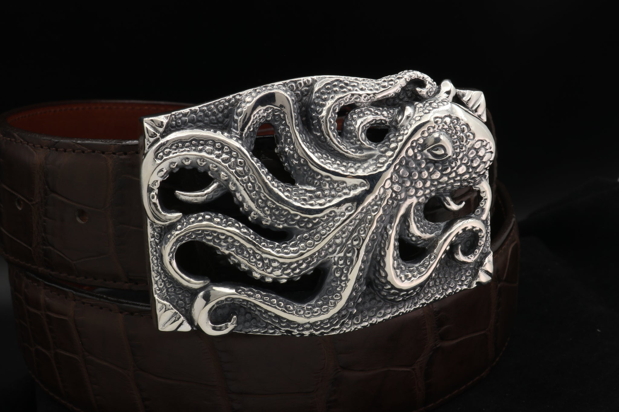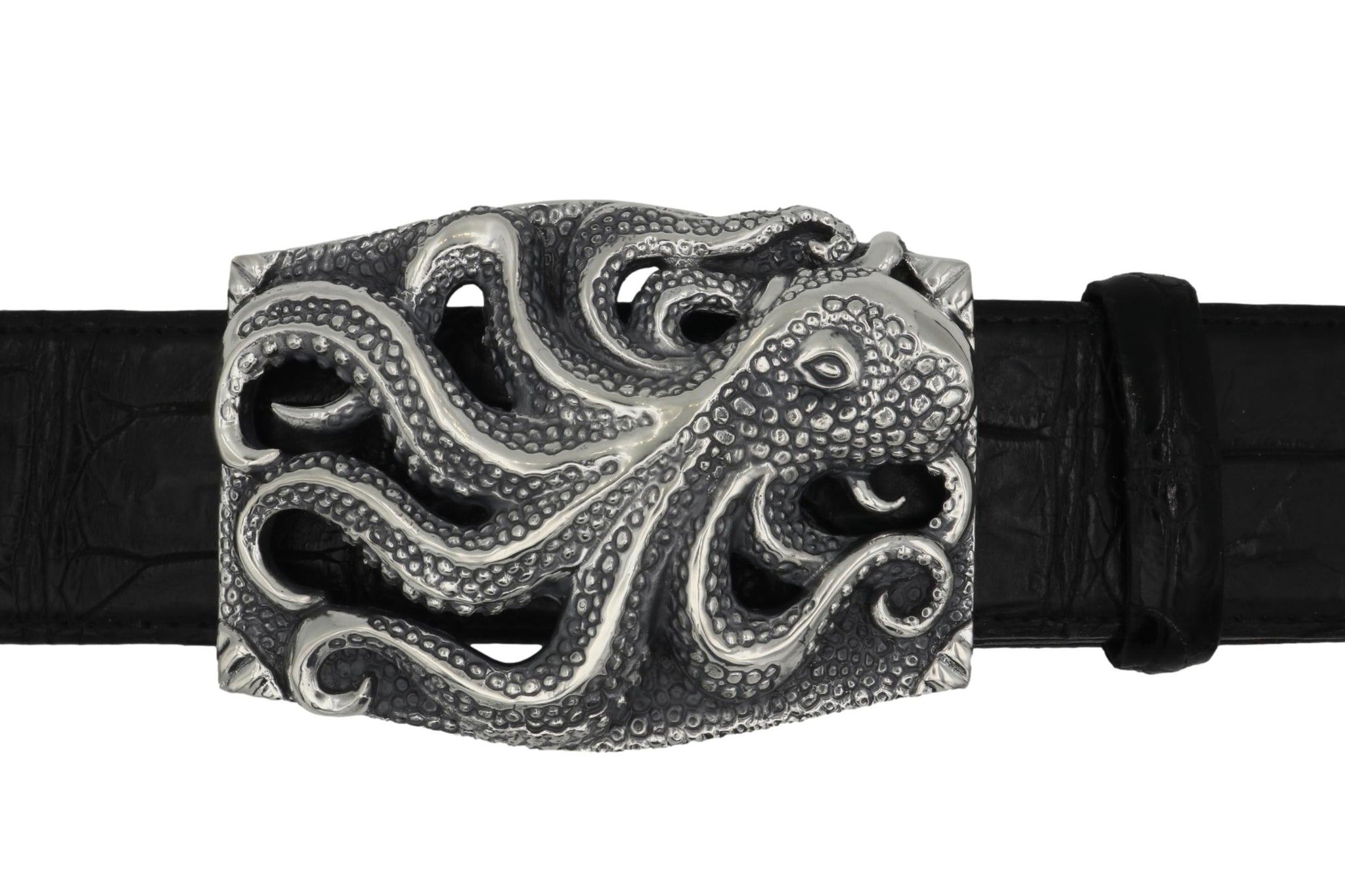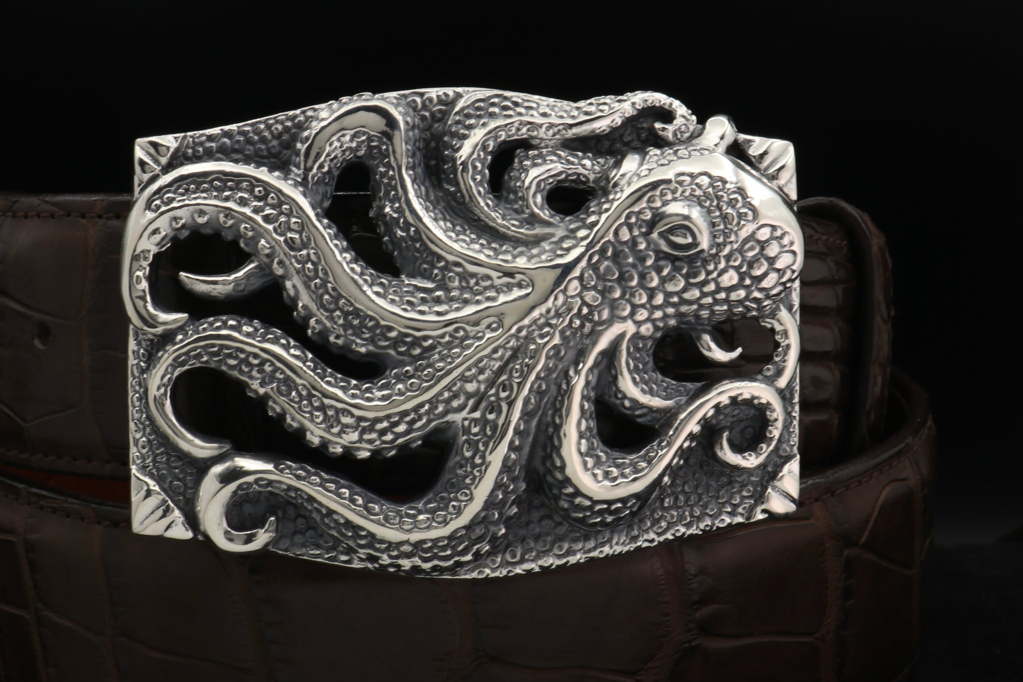 The Sterling Octopus Trophy buckle fits a 1 1/2" belt and showcases the type of detailed carving employing multiple textures...